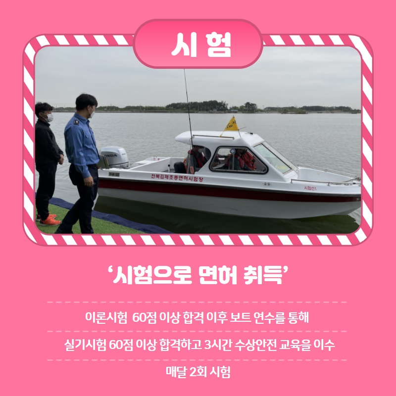 개인적으로 공부해서 이론시험보고 합격, 이후 보트 실기연수를 받고 실기 시험에 합격해야하는 면허시험과정